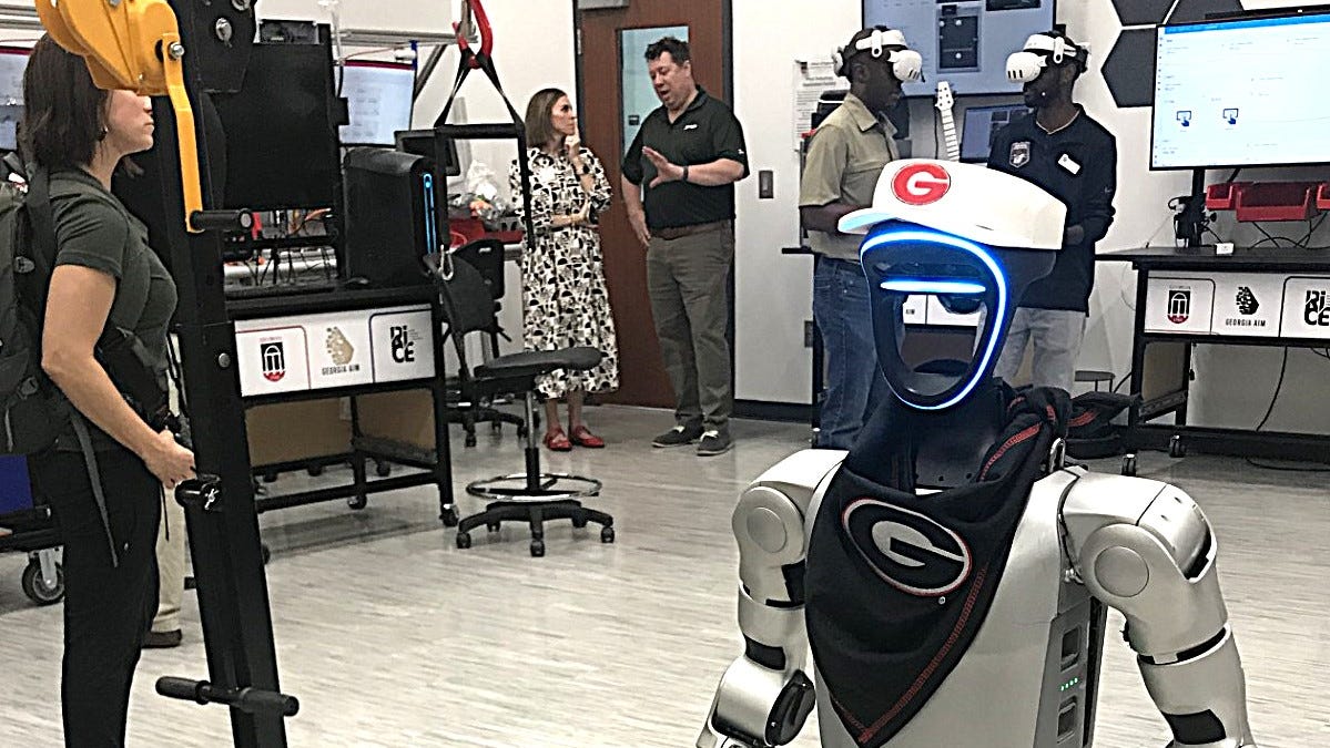 In the courtyard of the College of Engineering at the University of Georgia, a robotic dog and a robotic man recently walked, ran, and waved at visitors and students. The robot even blew a kiss to the crowd.